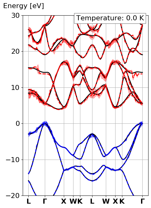 where the solid black lines are the traditional electronic bandstructure, the dashed lines are the electronic eigenenergies with electron-phonon renormalization at a defined temperature (here 0K). Finally the area around the dashed line is the lifetime of the electronic eigenstates.