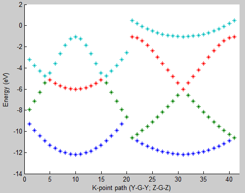 As you can see the unfolded band structure perfectly reproduces the anticipated dispersion relation E(k)=E_0 - 2A \cos(kb). We can even estimate the magnitude of the hopping matrix element between adjacent atoms V_{ssG} = -A. The band width is 4A = (-1) - (-12) = 11 eV which results in V_{ssG} = -2.75 eV.