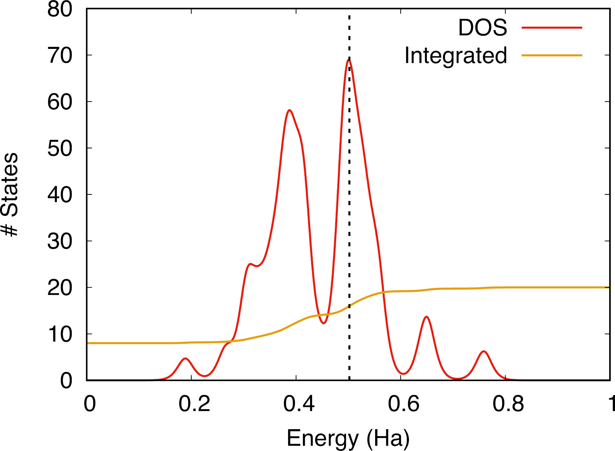 We observe that the up and down DOS channels have been “shifted” with respect to each other, which is a footprint of the presence of non-zero total magnetization in the crystal (either ferro- or ferri-magnetic). The integrated DOS yields the number of electrons for each spin direction, and we see that the magnetization arises from the fact that there are more up than down electrons at the Fermi level.